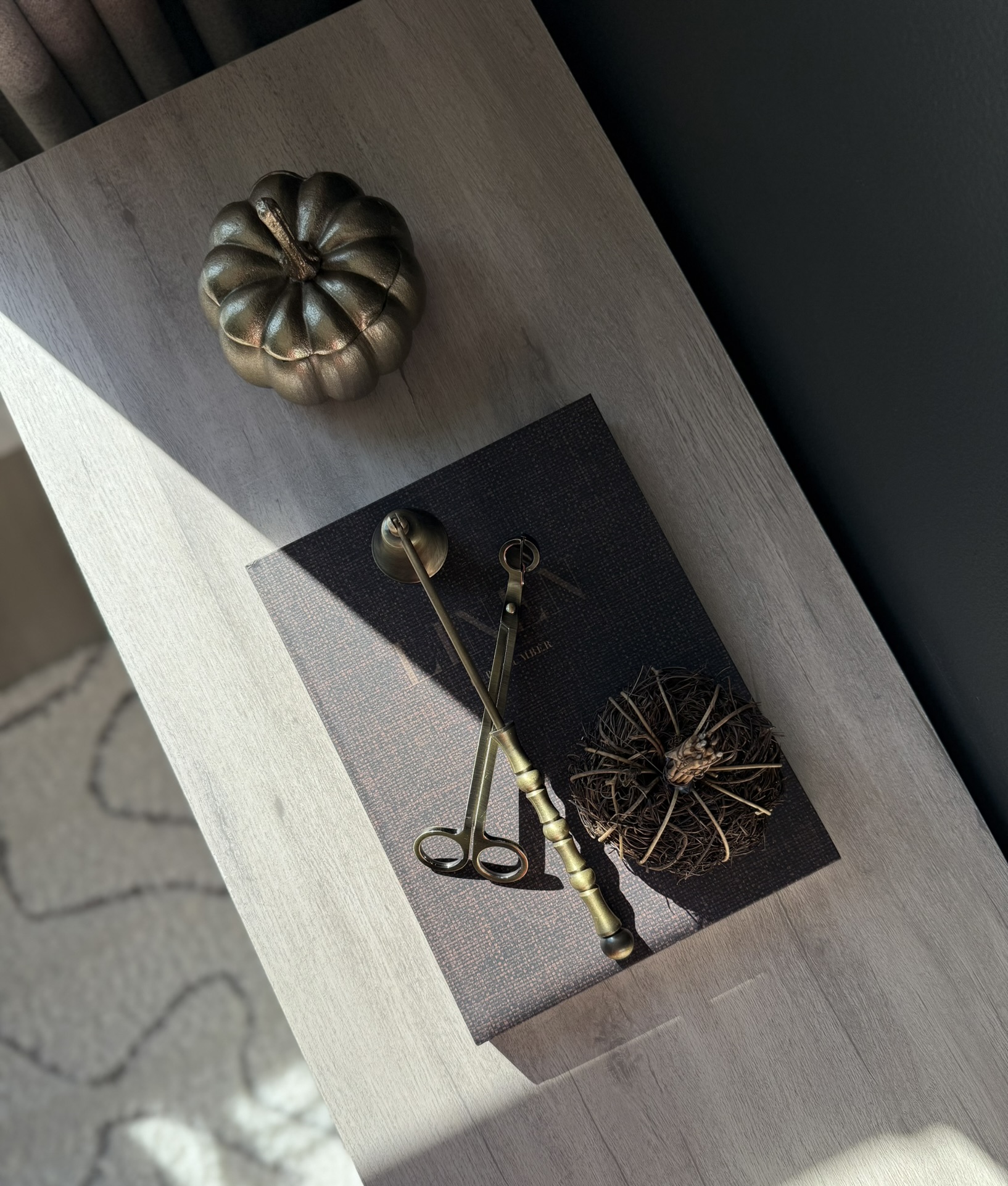 One of the easiest updates I made to the space was adding gold and brass colored accents around my living space. I swapped out a few everyday items for versions with a subtle metallic shine: brushed gold salt and pepper shakers and utensils and a brass pumpkin with a brass candle snuffer and wick trimmer.