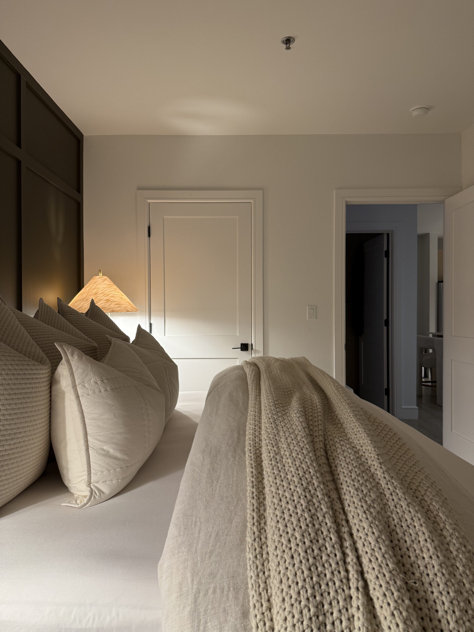 - Throw Blanket: A decorative throw blanket is where you can introduce different textures like knitted pieces, faux fur, or woven cotton. It is completely up to you where you decide to style yours, but I personally am a fan of placing mine right before the duvet fold on the featured image above.